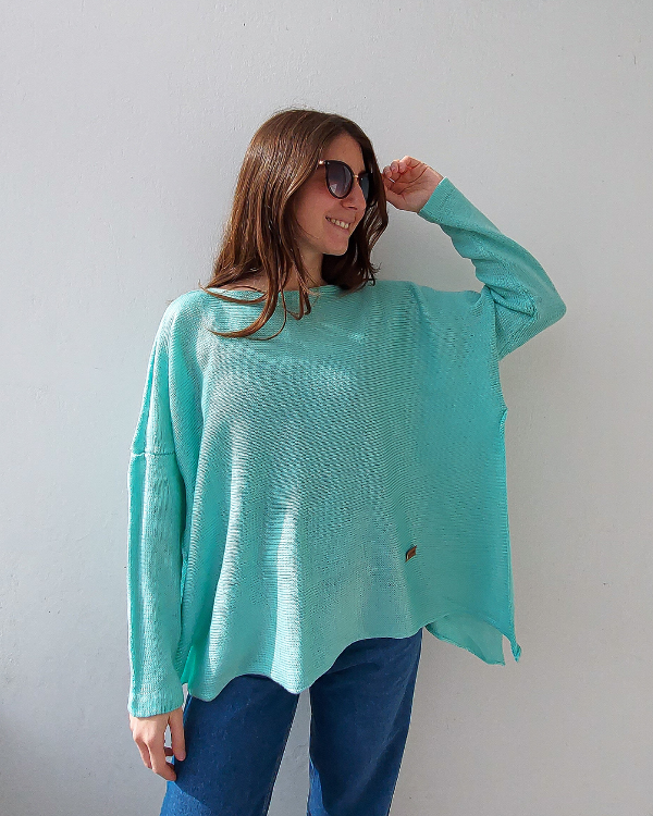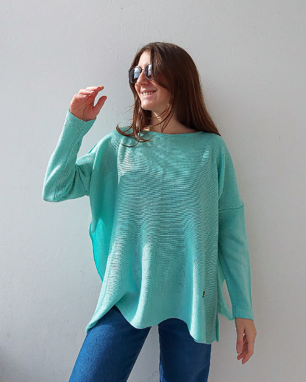 Liviano, cómodo, amplio, escote bote, abierto a los lados.