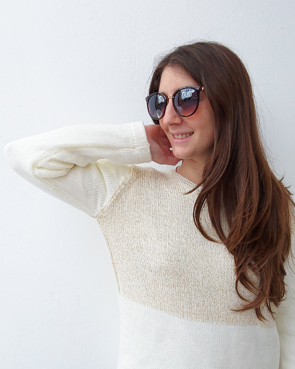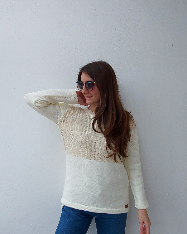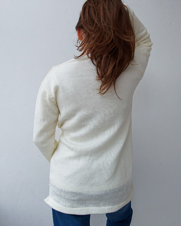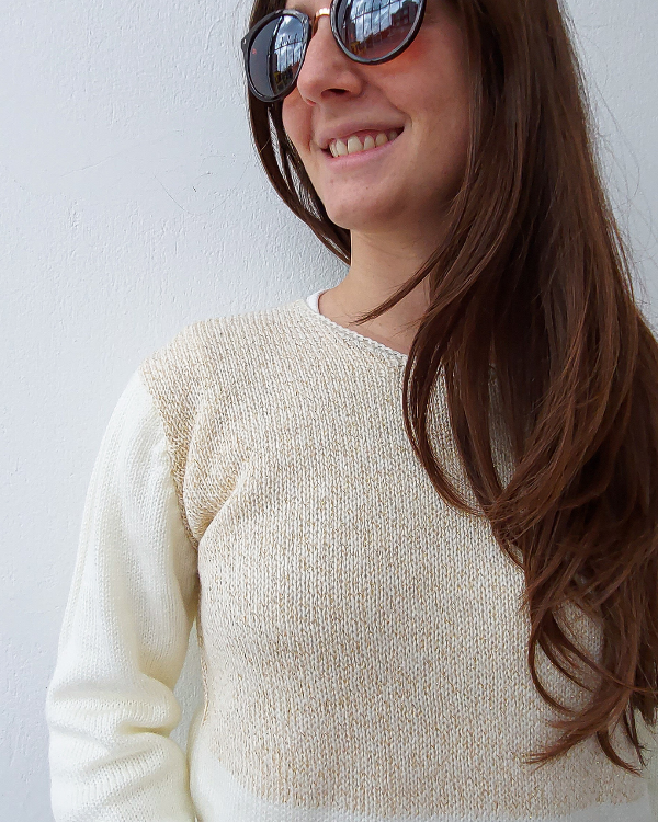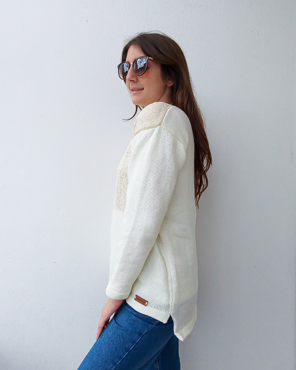 Sweater blanco con detalles en frente de lurex dorado, escote redondo.