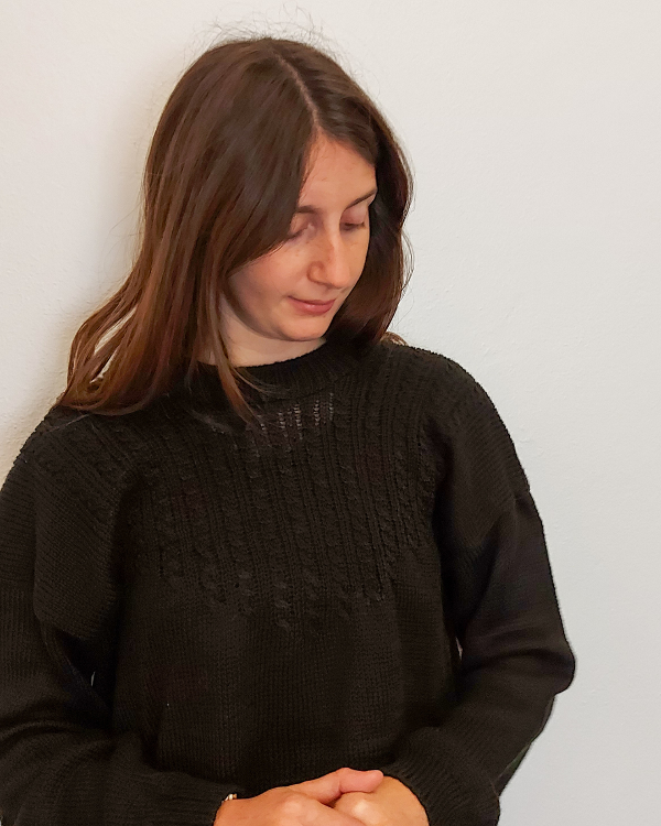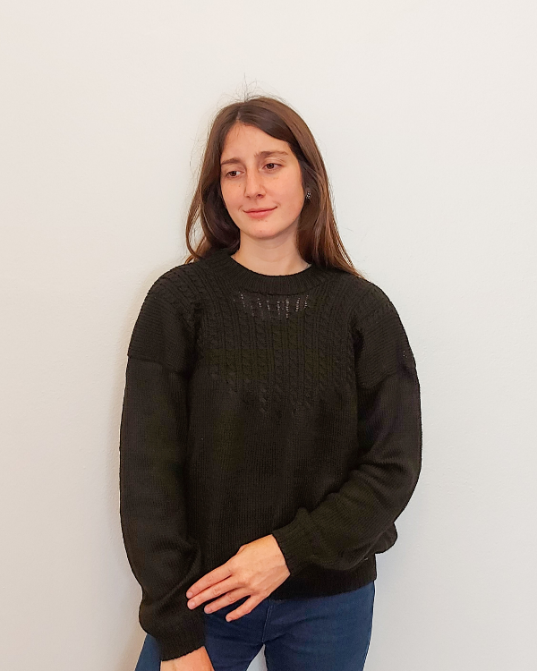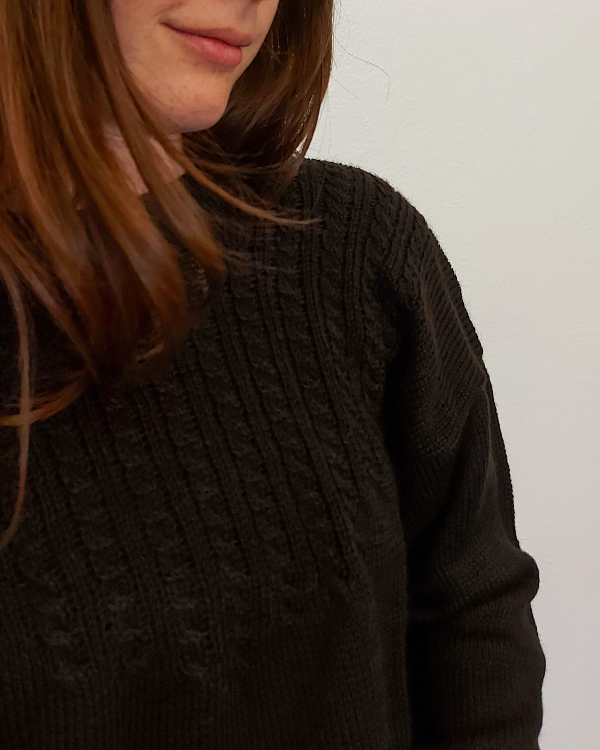 Sweater escote redondo con detalles de ochos en el escote y terminaciones en elástico .