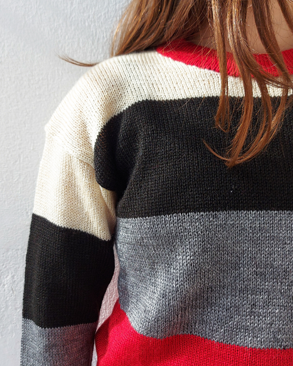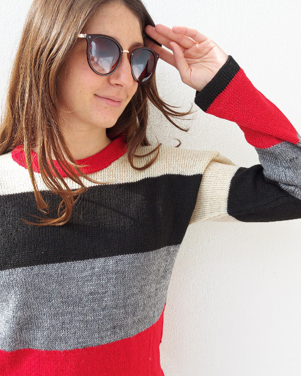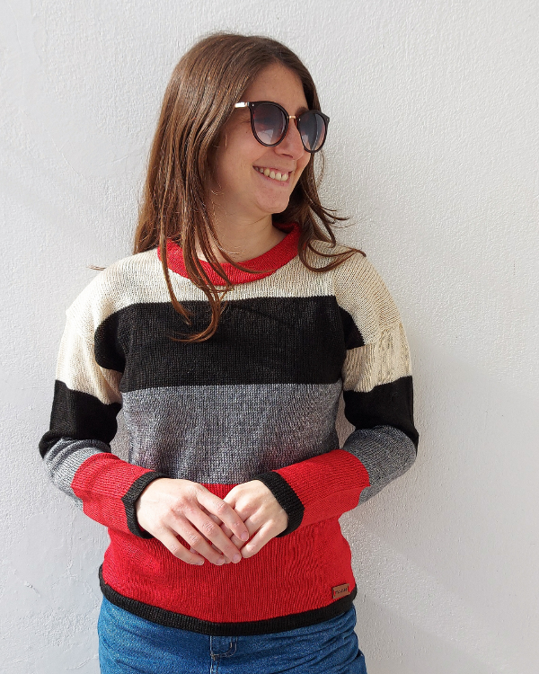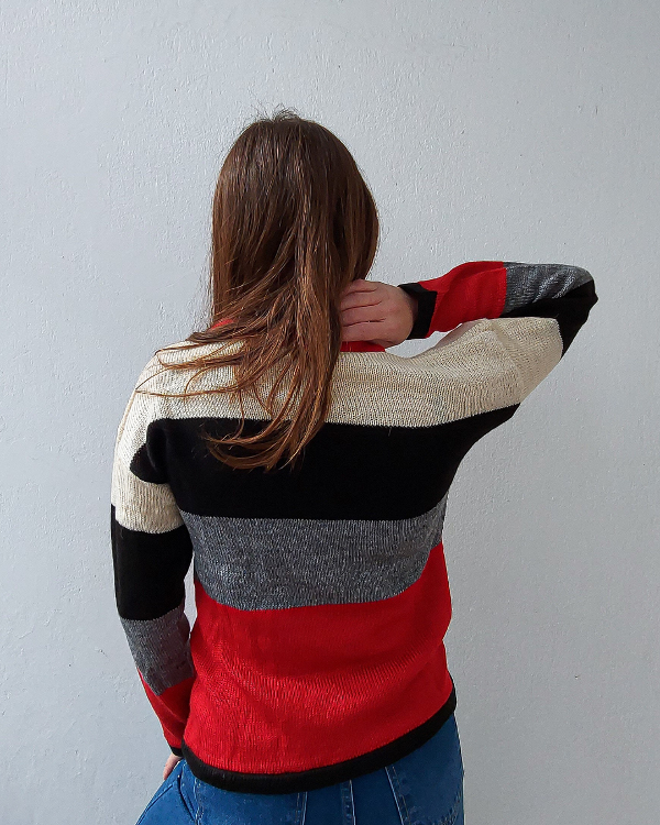 Con rallas color crudo, negro, gris y rojo.
