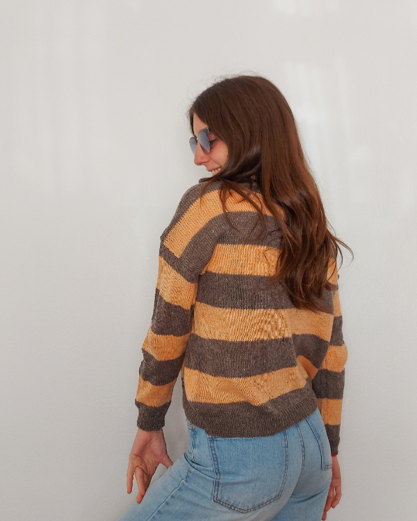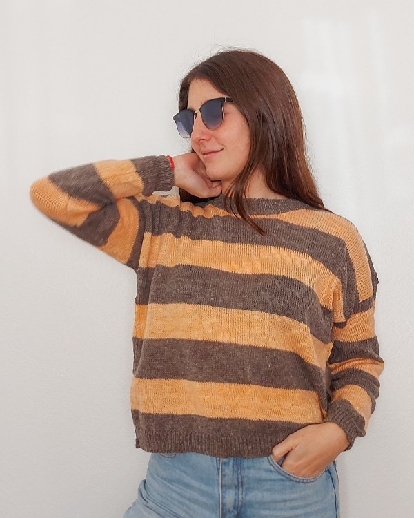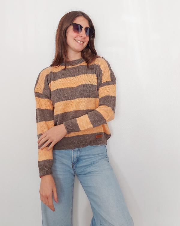 Sweater escote redondo con rayas en color salmón y visón, con terminaciones en elástico .